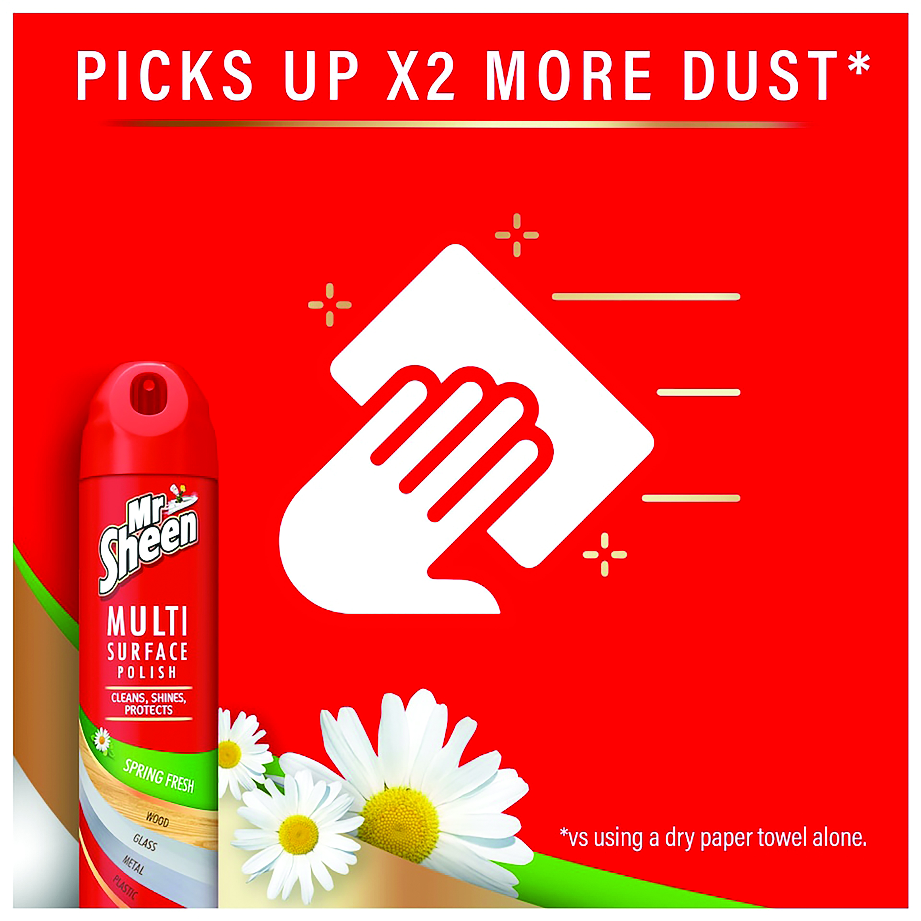 Dust contains hidden nasties such as dead skin cells, dried saliva and decaying insect waste. These tiny particles are food for house dust mites and make the surfaces in your home unclean. Mr Sheen with dust trap technology picks up 2 times more dust than using a dry paper towel. The unique formula acts like thousands of tiny magnets, attracting hidden nasties with every spray and because it's Mr Sheen, it will leave your surfaces with that rewarding smear free shine and fresh polish fragrance.