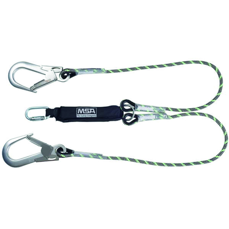 The MSA lanyards are available in web and kernmantel rope configurations with a variety of connectors. Energy-absorbing lanyards provide a means of connection between the fall arrest attachment of MSA full body harnesses and a qualified anchorage point. The energy absorber keeps fall arrest forces below 6 kN.* Twin-leg configuration* Leading edge approved for use in leading edge application* Cross stitch and a strong transparent covering sleeve that protects the ends and makes the stitches visible for easy inspection* Abrasion resistant thimble at the ends of the loops to prevents the rope from being damaged by the metallic contact of the connector* A coloured tracer strand that loses its colour in due course of time showing that the lanyard is now unfit for further use* 11mm Nylon Kernmantel rope* 35mm width Nylon tear webbing shock absorber* Galvanised alloy steel twist-lock karabiner with a minimum breaking strength of 25 kN and a gate opening of 16mm* Aluminium Alloy Scaffolding Hook with a minimum breaking strength of 23 kN and a gate opening of 60mm* Maximum arrest force of 6 KN and Maximum loading capacity of 100kg* EN355:2002 Personal protective equipment against falls from a height. Energy absorbers
