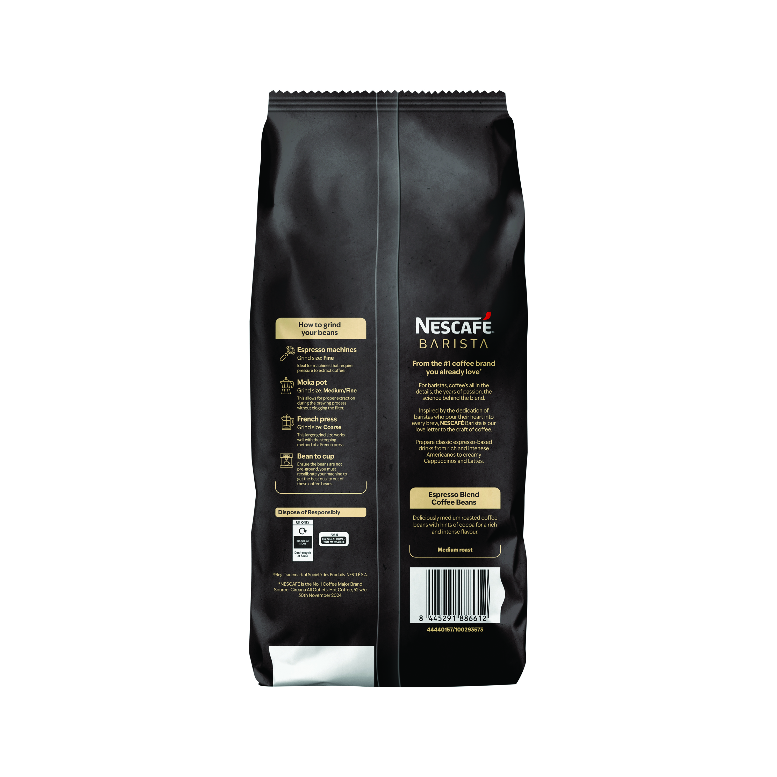 Nescafe Barista Signature Blend Espresso coffee beans help you perfect every coffee moment. Crafted for professionals, these medium roast whole roasted coffee beans offer a smooth, delicate taste with a level 8 intensity.