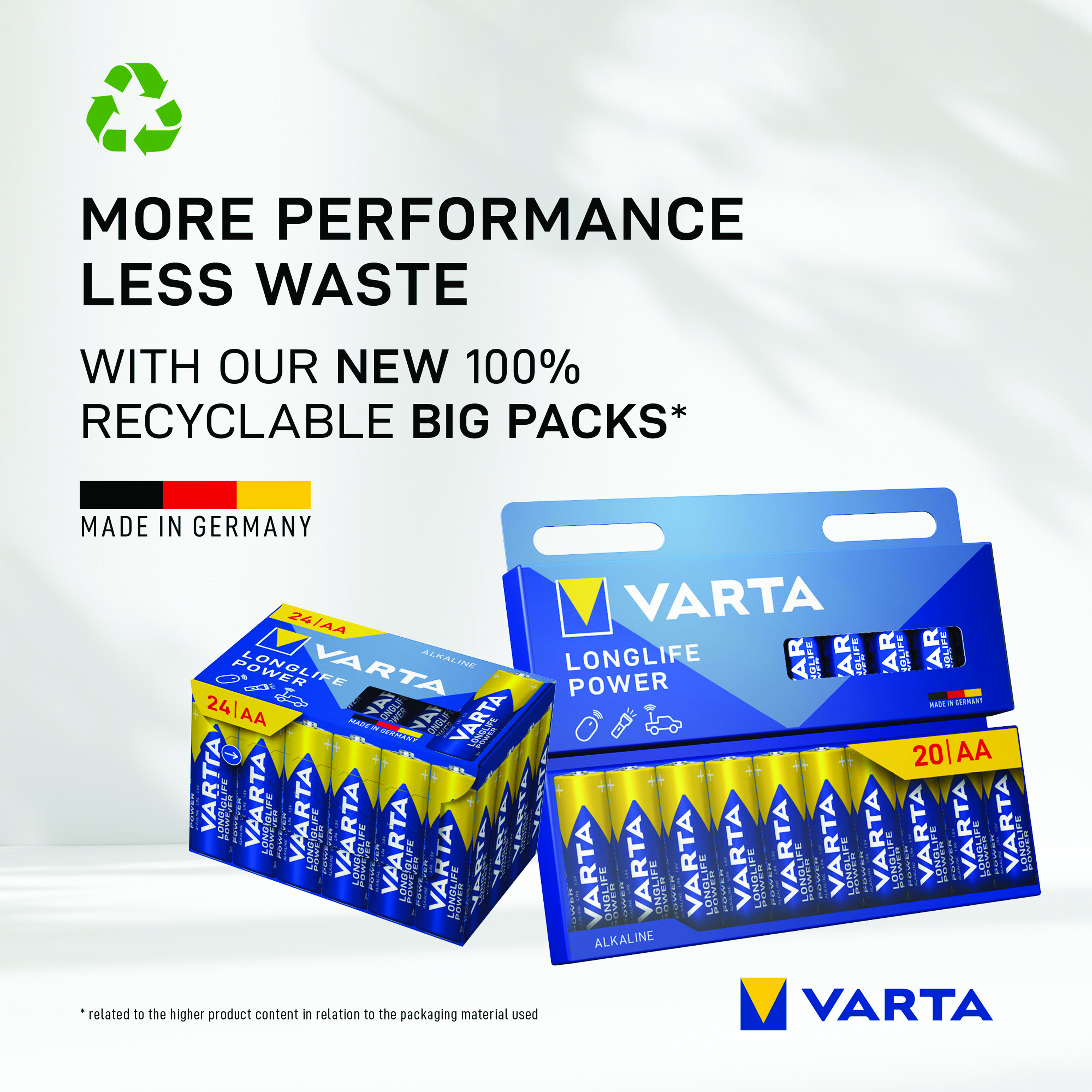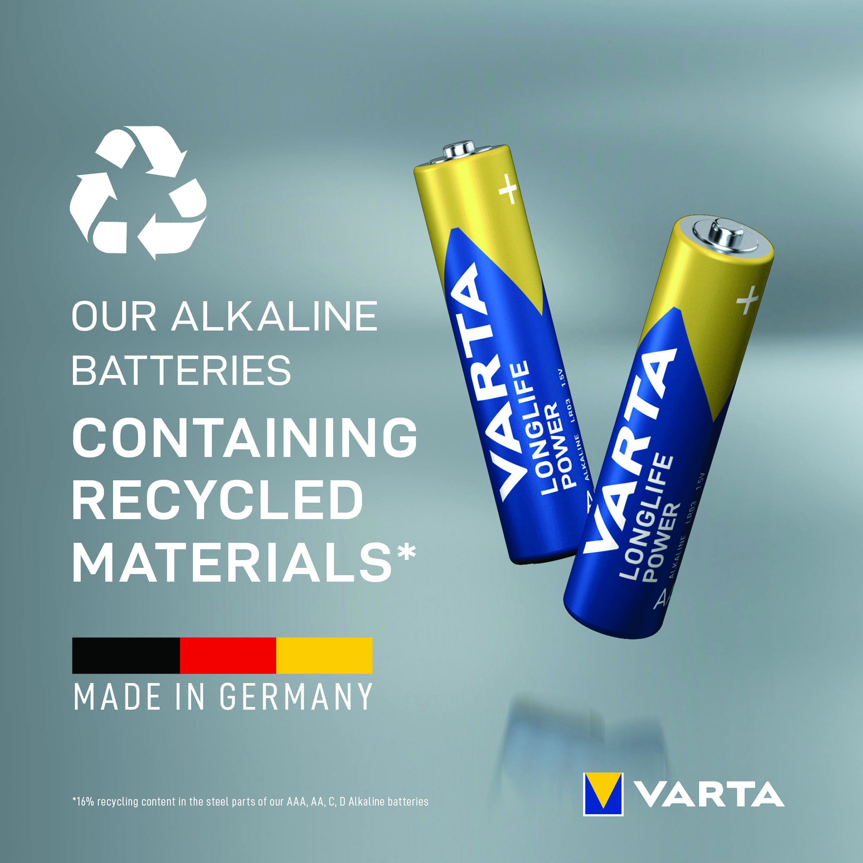 Varta Longlife Power is the most powerful of the Varta alkaline batteries. Developed especially for devices with high energy consumption. Stay independent with high performance battery power when using power hungry devices, such as remote controlled toys, computer equipment or LED flashlights.